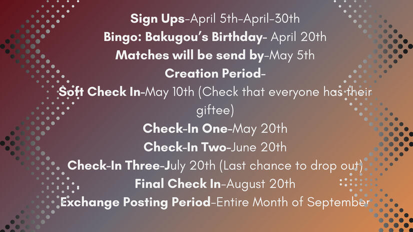 💣What exactly is an “exchange"?⚙️An exchange is generally centered around a specific ship, theme, or dynamic. The participants are anonymously paired with other participants who are compatible and they will create content (either a fic or art) for each other, then their creations will be revealed during the posting period. You'll be given a list of prompts (likes, dislikes, ratings) that are compatible with your preference and the name and social media accounts of your giftee. Until the time for posting, the identities of the gifters and giftees will remain anonymous.💣What are the requirements set for the exchange?⚙️Writers are expected to write one fic of 2,000 minimum word count with no maximum and artists are expected to create one piece of clean line art-flat with shading.💣How many pieces are required?⚙️Each contributor MUST complete one full work but may take on additional work if they become a pinch hitter.💣What sort of content will be permitted?⚙️All content is welcome at this pro-shipping event, but make sure to abide by any DNWs listed for your giftee and ensure proper tagging.💣Is joining a Discord server required?⚙️Yes! To participate, you MUST have a Discord account. All communications, check-ins, announcements, and team channels will be through Discord. Additionally, we ask our writers to also have Ao3 accounts to upload their works once the mini bang is completed.💣Since this is an 18 and up event, does that mean I must make 🔞 content?⚙️We encourage Tetsutetsu/Kirishima/Bakugou romance in all forms! From fluff to dead dove. We only ask that you tag appropriately and (for Discord) share in corresponding channels. We want to add more deliciousness to the "Bakugou Katsuki/Kirishima Eijirou/Tetsutetsu Tetsutetsu" Ao3 tag. Everything's good as long as the story focuses on a romantic and/or physical relationship for this throuple!💣Does my fic need to be completely new, or can it be a sequel?It can be both as long as the exchange fic is not already posted on a social media platform. The writer needs to create the content as the exchange progresses. But please, don’t share anything on Social Media until posting day. We want to surprise the giftee with your wonderful work!